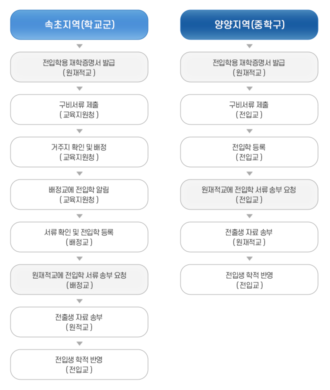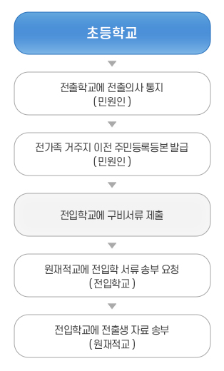 전출상담 및 절차확인(재적학교, 임의절차)→전입학 신청(전입희망교)→전입학 동의서(전입희망교 발급)→전입학 서류 송부 의뢰(전입희망교에서 재적학교로)→전출수속(원재적학교)→전입학수속(전입학교)